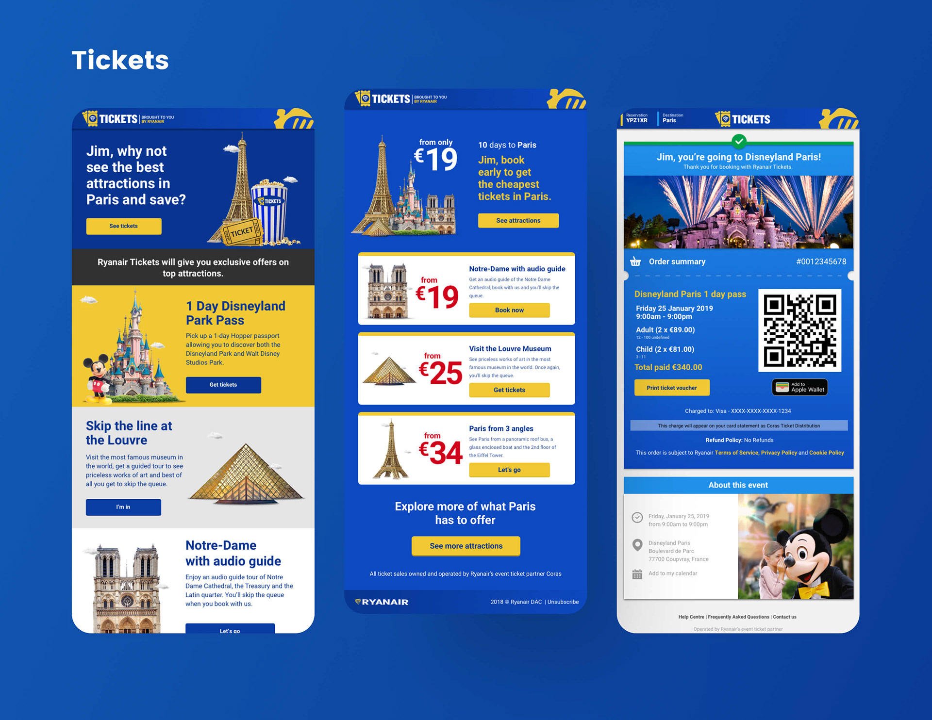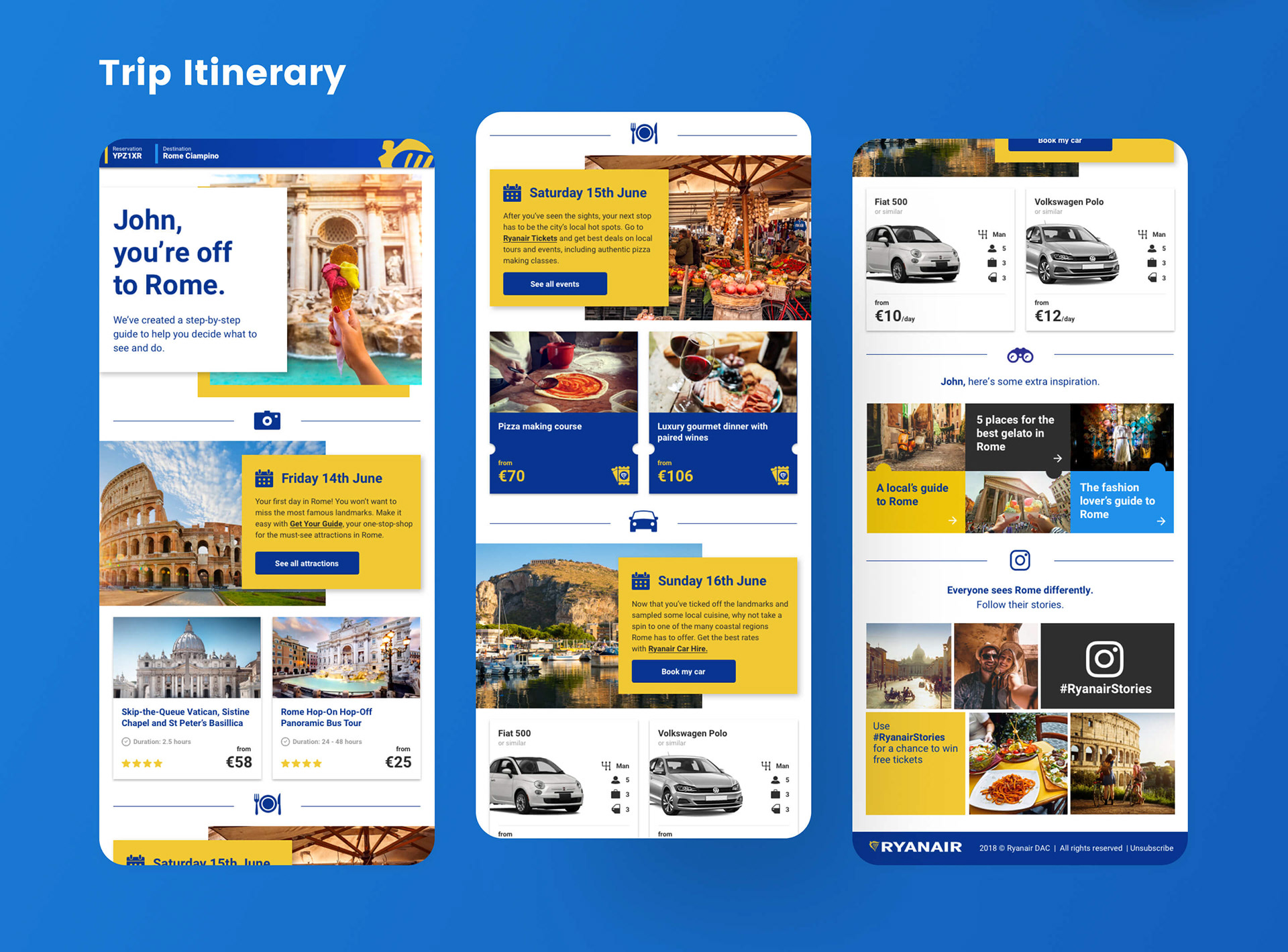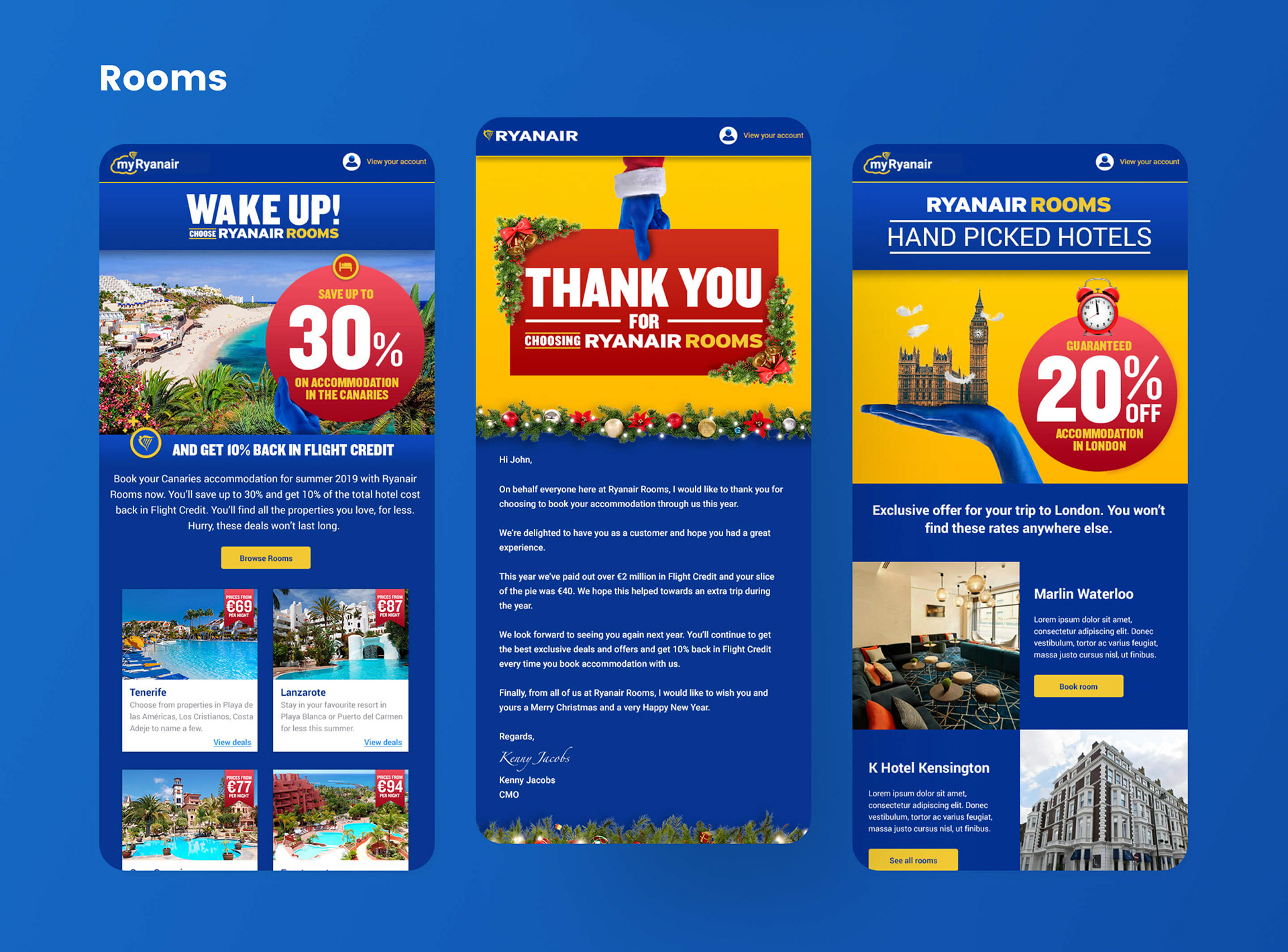 With over 35 million email subscribers, it's important that Ryanair has a robust and dynamic CRM program to speak to each of these customers. Below is a selection of email marketing comms designed by me for Ryanair and its subsidiaries — Rooms, Car Hire and Tickets. Included are examples from different pillars of communication in the Ryanair marketing funnel: Awareness, Consideration, Selling, Service and Tactical.
